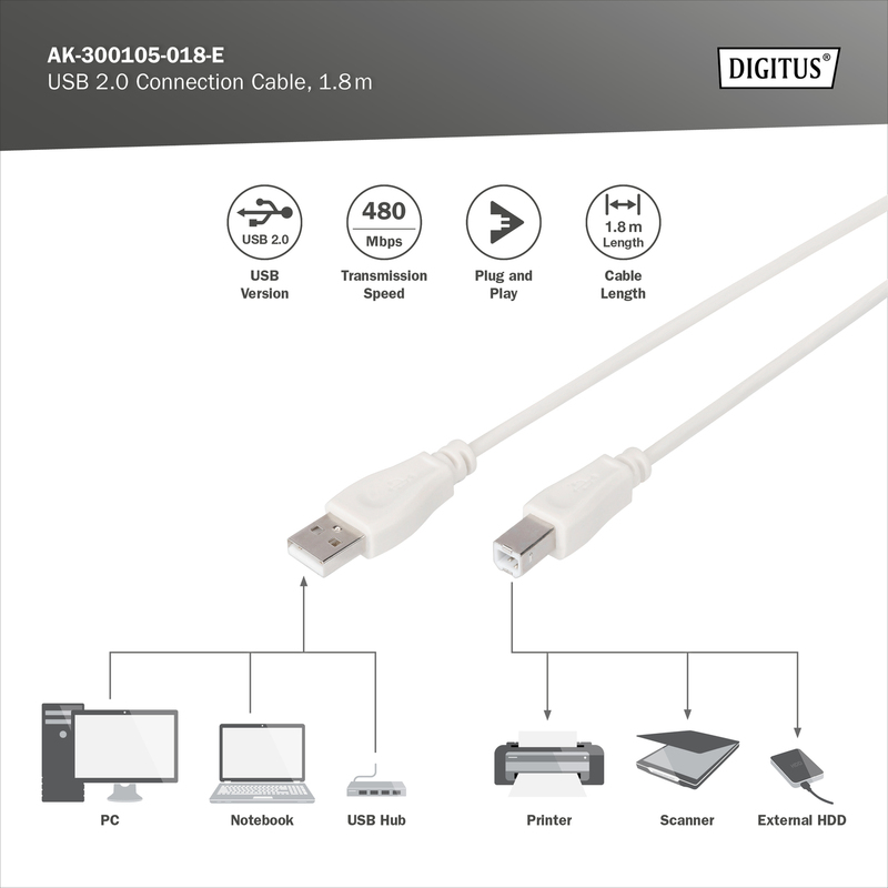 USB 2.0 connection cable, type A - B M/M, 1.8m, USB 2.0 conform, be