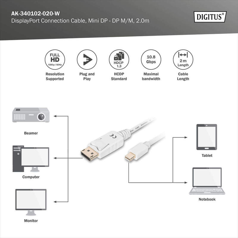 DisplayPort connection cable, mini DP - DP M/M, 2.0m, w/interlock, DP 1.1a conform, wh