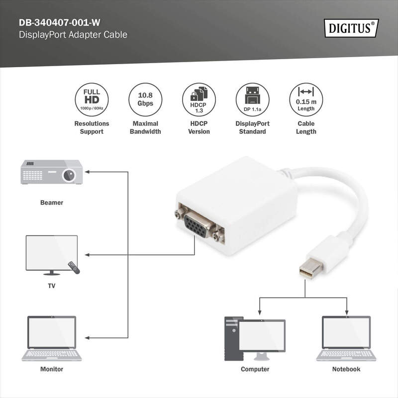 DisplayPort adapter cable, mini DP - HD15 M/F, 0.15m, DP 1.1a, CE, wh