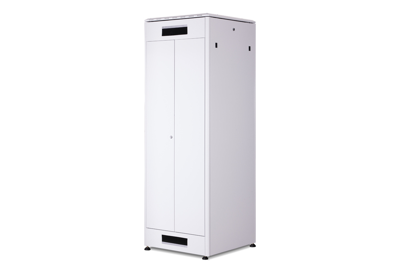 The Network Racks of the Unique Series were designed for the user friendly installation of active- and passive network components accompanied by a neat cable management. Each rack consists of up to 1.5 mm strong steel sheet material which ensures a very good stability as a robust steel construction due to special plate curving technique. The color is created by powder coating in grey (RAL 7035) and black (RAL 9005). For certain conditions, where the set-up location is difficult to reach, the rack can be disassembled. Doors can be easily detached and the door stop can be changed from right to left. The roof is present with an added lid which contains air ventilation slots for a better air circulation. Furthermore the roof is ready for the mounting of an air ventilation unit. Each network rack contains 2 pairs (4 pieces) of 483 mm (19”) profile rails inside which are galvanized and with height unit marking (countable from both directions). They are variable in depth and connected with additional depth support bars to realize extensive 483 mm (19”) equipment installations. An important aspect for each installation is the cable management. The base of each rack is equipped with a sliding cable entry panel with rubber sealing. Racks from 26U are equipped with two cable entries with brush strips on the rear side above- and underneath the door. For cabinets with 800 mm width, the possibilities of cable management get enhanced with additional cable entries with brushes left and right in the top and base chassis. Furthermore there are mounted vertical cable ducts with shutter left and right to the 483 mm (19”) profile rails in the front (on cabinets from 32U and 800 mm width). An extensive portfolio of accessories for cable management, shelves, etc. will help to meet many requirements in daily use.