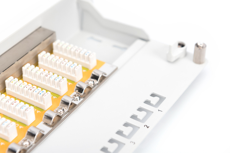 • A closed metal housing including central grounding connection provide shielding for the 8-port patch panel and LSA rails for mounting the network installation cables