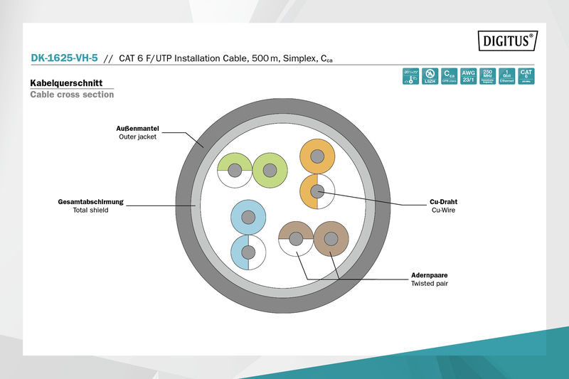 The Digitus® Professional Cat.6 F/UTP installation cable is characterized by the following cable construction 4x2x AWG23/1 and reaches a transmission frequency up to 250 MHz. The halogen free cable jacket is conform to the standard IEC 60332-3-24, FRNC-C, LSZH-1 and CPR Euro class Cca. The cable is suitable for building structured cabling in the secondary and tertiary area. Compliant with the following standards ISO/IEC 11801, DIN EN 50173, DIN EN 50288-5-1.